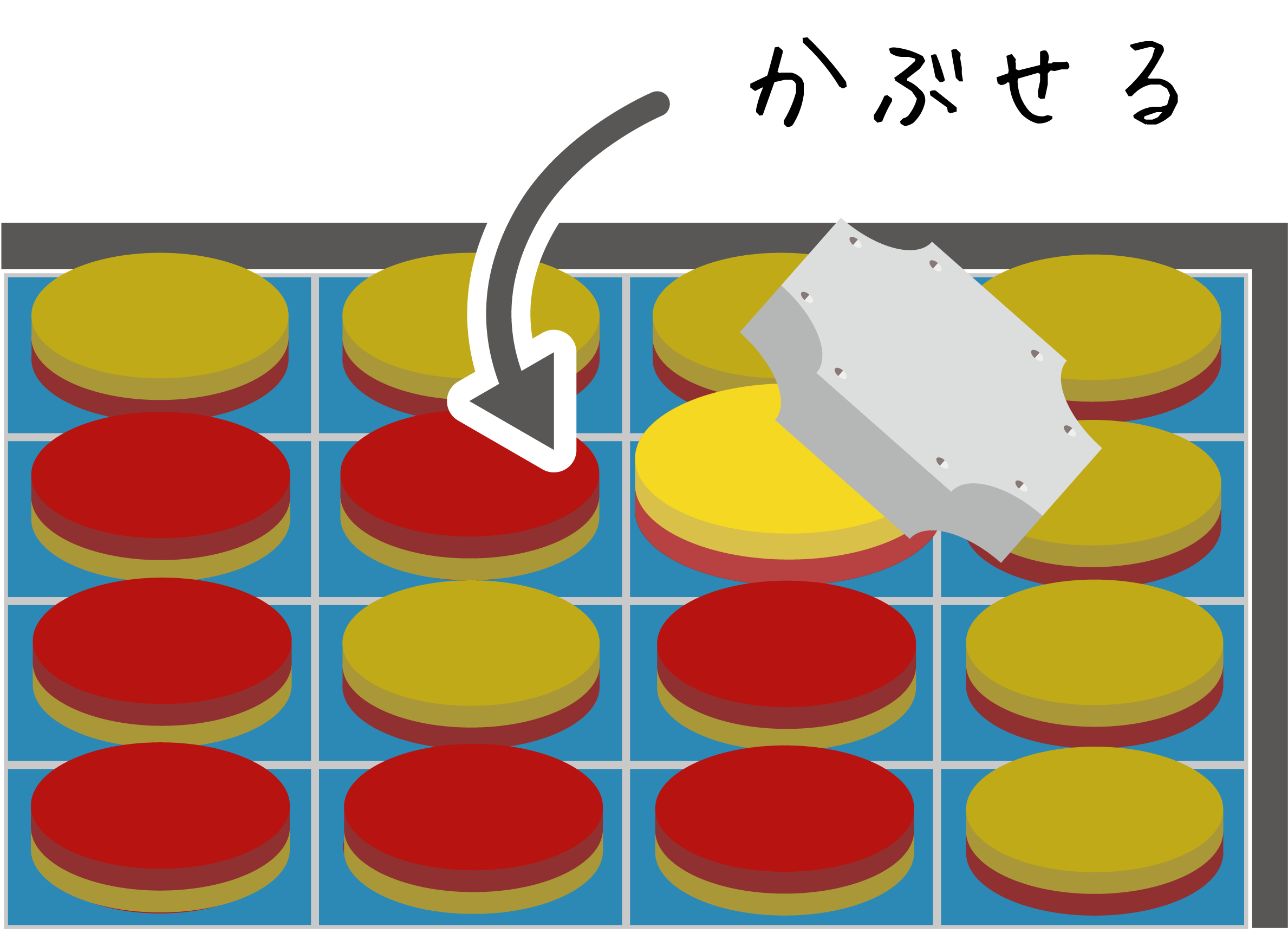 第一ゲーム終了後、スタックカバーを使用して新たな駒を配置します。このとき、自分の駒で挟んだ相手の駒をひっくり返して色を変える楽しさを体験できます。全ての駒がスタックカバーで覆われた時点で第二ゲームが終了します。